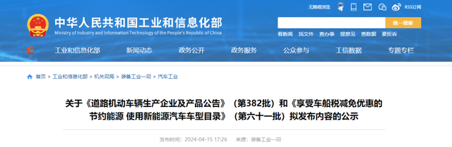 2024年4月15日,工信部对《道路机动车辆生产企业及产品公告》(第382批)和《享受车船税减免优惠的节约能源 使用新能源汽车车型目录》(第六十一批)拟发布内容予以公示,网上公开征求意见。
