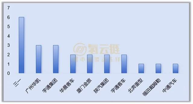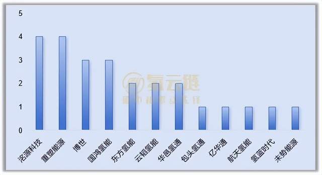 从12家配套企业来看,洺源科技和重塑能源分别以配套4款的数量并列第一,博世和国鸿氢能则分别以3款的数量并列第二,东方氢能、云韬氢能和华邑氢通则分别以2款数量并列第三,其余配套商均为1款。
