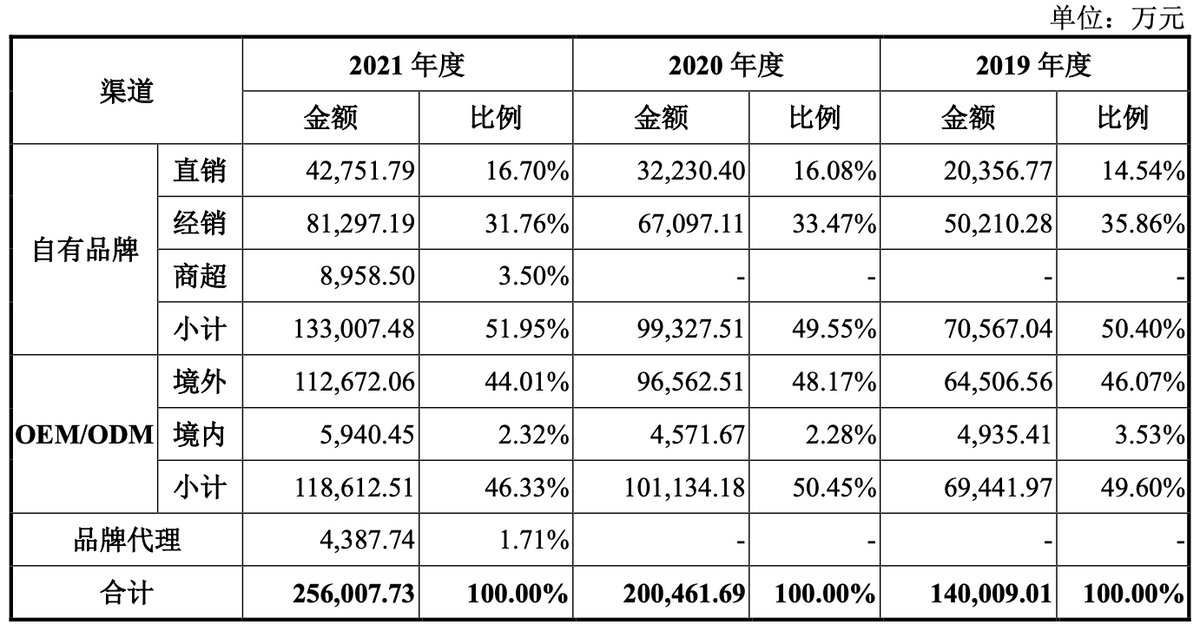 其中,自有品牌实现营收分别为7.06亿元、9.93亿元、13.30亿元,占主营业务的比例分别为50.40%、49.55%和51.95%; OEM/ODM 业务实现营收分别为6.94亿元、10.11亿元和11.86亿元,占主营业务的比例分别为49.60%、50.45%和46.33%;品牌代理业务系乖宝宠物2021 年 K9 Natural 和 Feline Natural 的代理商后产生,实现营收4387.74万元,占主营业务收入的比例为1.71%。