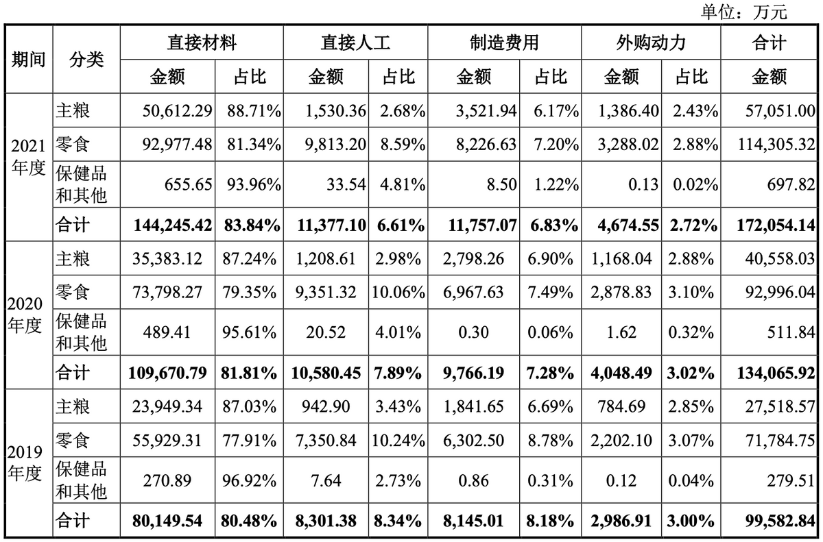 乖宝宠物产品的主要原材料包括主料、辅料和包装材料,占比较高,这使得公司受原材料价格波动影响较大。2019年-2021年,乖宝宠物的直接材料成本分别为8.01亿元、10.97亿元和14.42亿元,占主营业务收入的比例分别为80.48%、81.81%和83.84%。