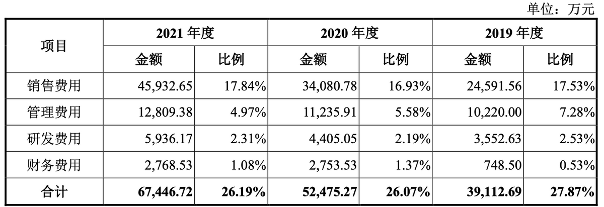 值得一提的是,乖宝宠物近三年来在销售方面的投入累计逾10亿元。2019年-2021年,乖宝宠物的销售费用分别为2.46亿元、3.41亿元和4.59亿元,占营业收入的比例分别为17.53%、16.93%和17.84%。其中,业务宣传费占据了三成地位。