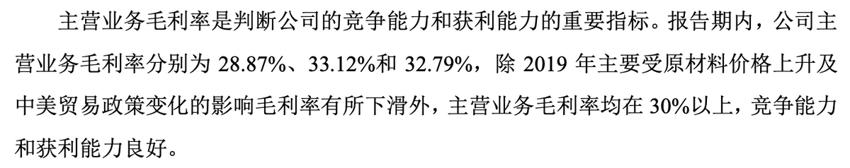 2019年-2021年,乖宝宠物主营业务毛利率分别为 28.87%、33.12%和32.79%。其中,2019年毛利率略有下滑,系原材料价格上升及中美贸易政策变化的影响所致。