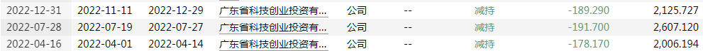 其中,2022年7月19日至2022年7月27日,广东科创减持191.7万股,占总股本比例为1.01%,减持均价为13.6元/股;2022年11月11日至2022年12月29日,广东科创减持189.29万股,占总股本比例为1%,减持均价为11.23元/股。广东科创合计减持380.99万股,减持比例2.01%。