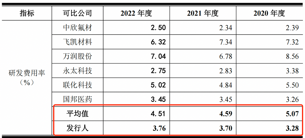 招股书显示,兴欣新材研发费用金额分别为1224.82万元、1878.33万元和2911.91万元,占当期营业收入的比例分别为3.28%、3.70%和3.76%。而同期同行业可比公司的研发费用率均值分别为5.07%、4.59%和4.51%,可以看出报告期内兴欣新材的研发费用率远低于同行公司。
