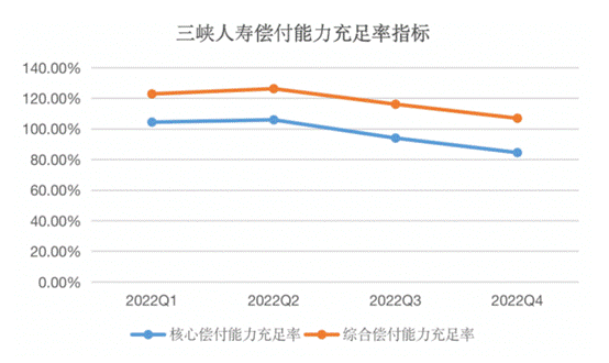 需要聚焦的是,2022年四季度末,三峡人寿综合偿付能力充足率为106.87%,比上季度末下降9.17个百分点;核心偿付能力充足率为84.45%,比上季度末下降9.49个百分点。