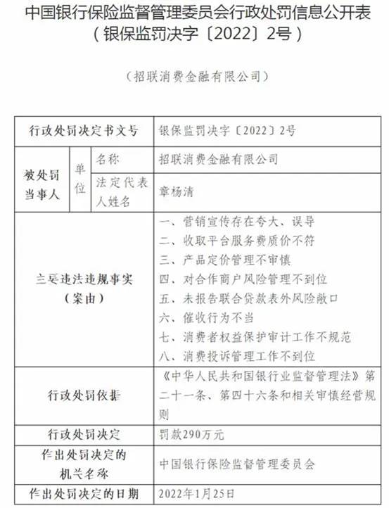 单在2022年2月,招联消费金融就因存在8项违法违规事实被罚款290万元。具体违规内容包括:营销存在夸大、误导;收取平台服务费质价不符;产品定价管理不审慎;对合作商户风险管理不到位;未报告联合贷款表外风险敞口;催收行为不当;消费者权益保护审计工作不规范和消费投诉管理工作不到位。