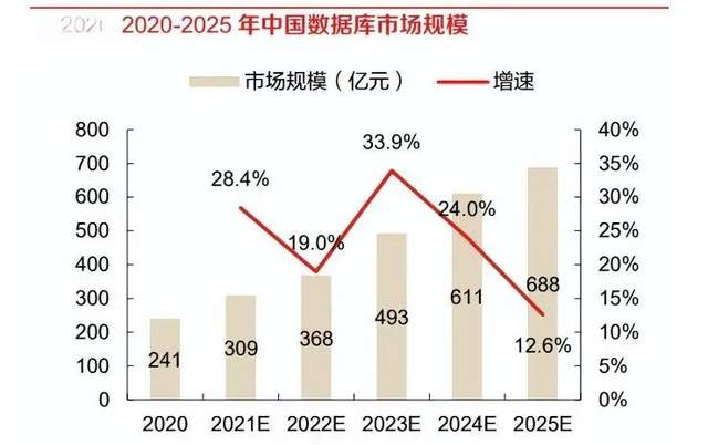 据中国信通院发布的《数据库发展研究报告2021》统计,2025年中国的数据库市场规模将达到 688 亿元,5年年复合增长率达23.4%。目前,海外巨头仍占据国内数据库市场较大份额,但国产数据库经历多年沉淀,已经具备初步竞争力。