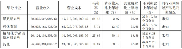 聚氨酯业务包括异氰酸酯和聚醚多元醇两部分,大宗氰酸酯又分为MDI和TDI两类。2022年,聚氨酯业务实现营业收入同比增长3.97%,但营业成本同比增长20.98%,成本涨幅明显大于收入增幅,毛利率下降至24.45%,较2021年减少10.62个百分点。