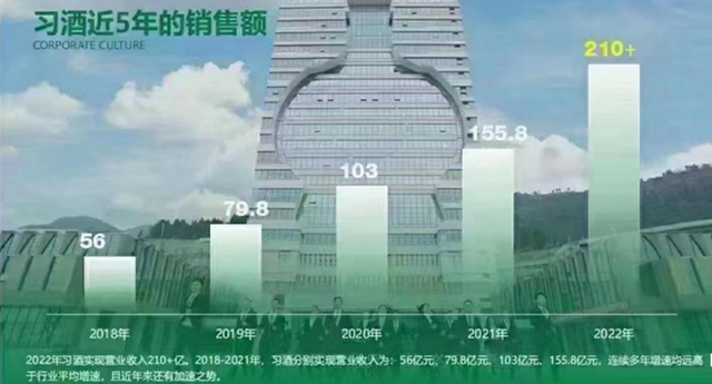 资料显示,2017年至2022年,习酒的销售额分别为35.78亿元、56亿元、79.8亿元、103亿元、155.8亿元和210亿元,6年时间销售额累计增长了487%,年平均增长率近81.2%。