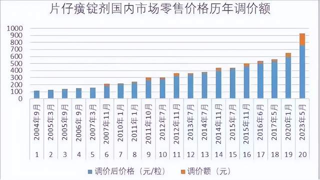 过去20年间,片仔癀多次提价。据西南证券不完全统计,2004年至2020年,片仔癀锭剂产品一共提价19次,零售价从325元/粒升至590元/粒,提价幅度81.54%。