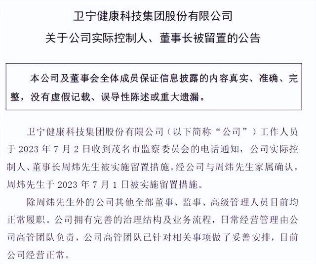 卫宁健康在公告中表示,“截至本公告披露日,公司尚未收到上述留置相关书面通知,亦未收到有权机关对公司的任何调查或者配合调查文件,暂未知悉留置调查的进展及结论,公司将持续关注上述事项的后续情况”。