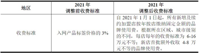 周六福从加盟商身上赚取的服务费大幅增长,除了加盟店数量增加外,还因为加盟费用政策的变化。周六福服务费有两种收取方式,一种是按不同地区收取固定费用,另一种是按产品销售收取浮动费用。