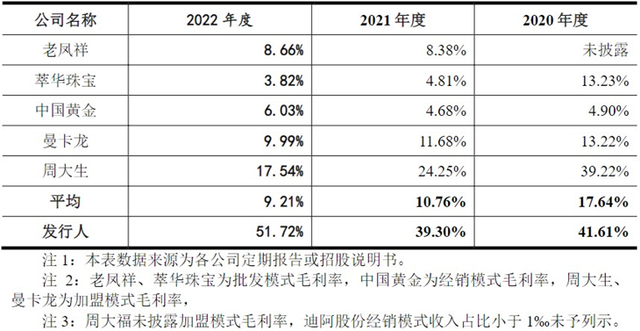 服务费包括包括品牌使用费和特许经营费。报告期内,随着加盟店数量增加,周六福从加盟商身上赚取的服务费分别达到3.21亿元、4.76亿元和7.08亿元。由此,周六福加盟模式的毛利率显著高于同行,报告期内分别为41.61%、39.30%和51.27%。