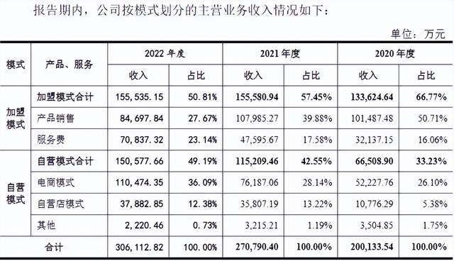 加盟模式收入占比出现下滑,主要原因是周六福发展自营业务尤其是电商网店。报告期内,周六福电商收入占比分别为26.10%、28.14%和36.09%,自营门店收入占比分别为5.38%、13.22%和12.38%。