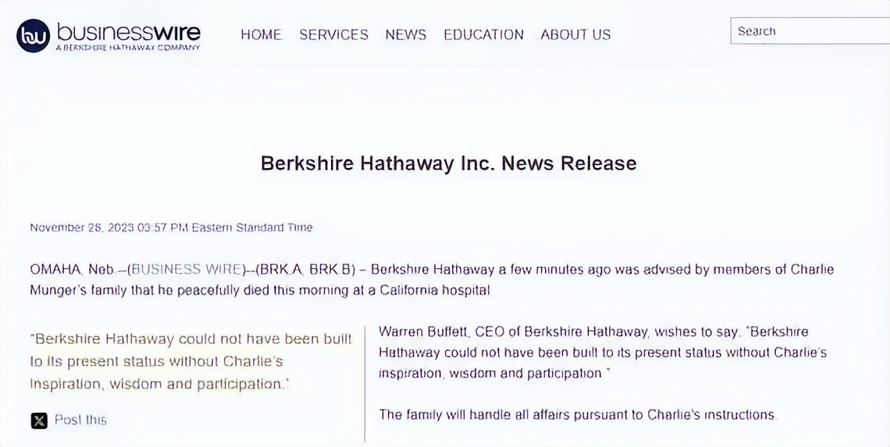对此,巴菲特发表声明称,“如果没有查理的灵感、智慧和参与,伯克希尔-哈撒韦公司不可能发展到今天的地位。”