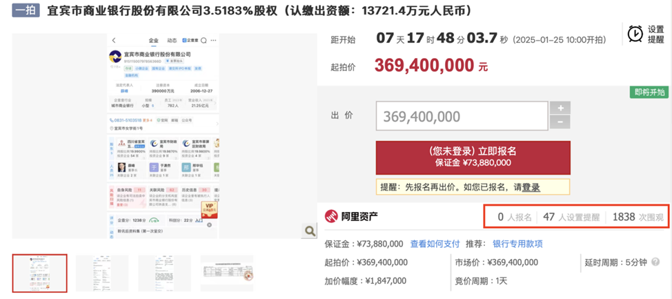 1月15日,阿里司法拍卖平台挂出宜宾银行3.5183%股权(认缴出资额:13721.4万元人民币)将于1月25日被首次司法拍卖的信息公告,本次拍卖的起拍价约为3.694亿元,本次股权起拍价格对应持股比例与宜宾银行在港交所估值较为接近。