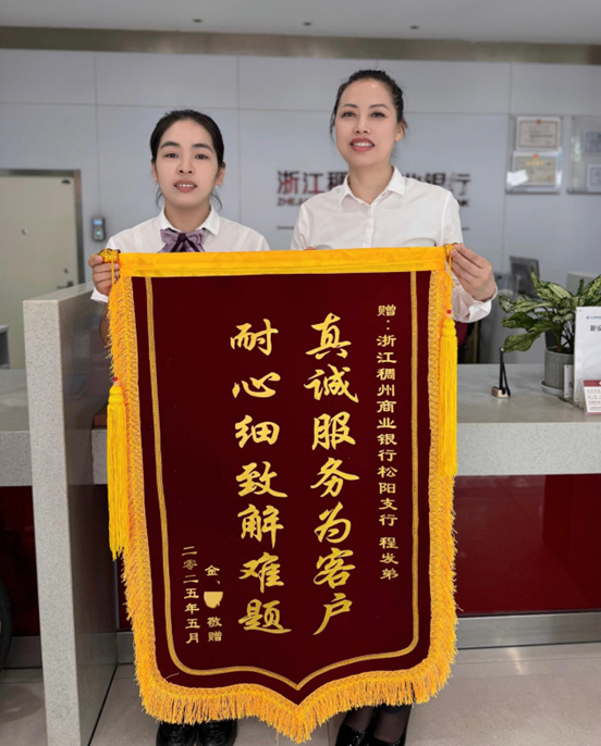 在此次成功堵截中,稠州银行丽水松阳支行程发弟发挥了关键作用。她表示,一面锦旗,一份信任,更是一份责任,成果的取得离不开银行内部的高效协同,与警方的密切联动。为营造安全稳定的金融环境贡献力量,她义不容辞。