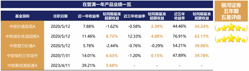 其中,管理超5年的有三只基金,近五年业绩对比基准均有较大超额收益,中欧价值发现、中欧成长优选回报均获得银河证券五年期基金五星评级。