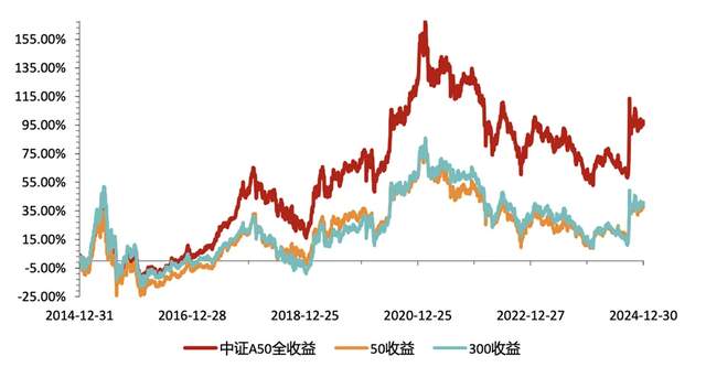 ▲中证A50全收益指数与其他宽基全收益指数历史业绩走势图对比,来源: Wind资讯,中证指数有限公司