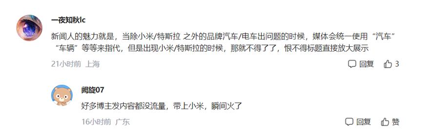 小米相关话题在商业领域热度居高不下,引发的讨论也是五花八门。网友“一夜知秋lc”犀利指出媒体对汽车问题报道存在“双标”。小米、特斯拉出问题便大书特书,其他品牌则模糊指代,这一现象引发了大众对媒体公正性的深度思考。媒体的报道倾向,在一定程度上影响着公众对品牌的认知,而小米无疑成为了这种“双标”下的焦点之一。