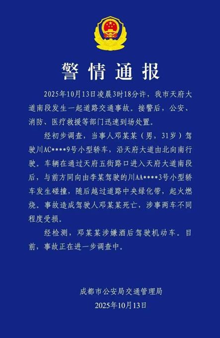 10月13日凌晨,四川成都天府大道的一起小米汽车交通事故,将小米汽车推至舆论风口浪尖。据通报,邓某某酒后驾驶小米汽车与前车碰撞,越过绿化带起火致其身亡。目击者记录显示,涉事车辆事发前摇摆不定、疑似超速,碰撞后翻滚起火,路人救援因无专业工具失败。