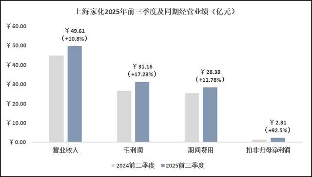 2025年前三季度,上海家化实现毛利润31.16亿元,同比增长17.19%,同期的期间费用支出同比增幅为11.78%,低于毛利增速;开源节流并举之下,前三季度扣非归母净利润同比增长92.5%,录得2.31亿元;毛利率较同期提升3.4个百分点,为62.81%。