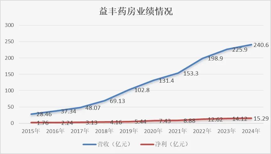 依靠不断扩店的策略益丰药房尝尽甜头。公司的营收规模从2015年的28.46亿元增长至2024年的240.62亿元,归母净利润同步从1.76亿元攀升至15.29亿元。资本市场也给予积极回应,2020年巅峰时期总市值一度逼近580亿元。