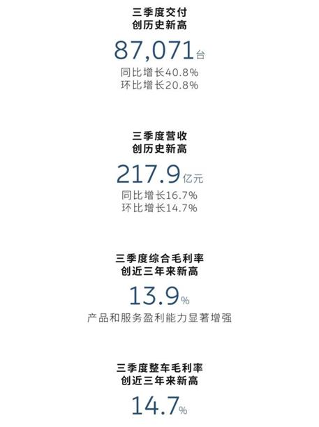 蔚来实现营收与净利润双增长,背后是汽车销量增加和盈利能力增强。第三季度,蔚来交付汽车为87071辆,同比增长40.8%,环比增长20.8%。其中,蔚来品牌交付36928辆汽车,乐道品牌交付37656辆汽车,萤火虫品牌交付12487辆汽车。