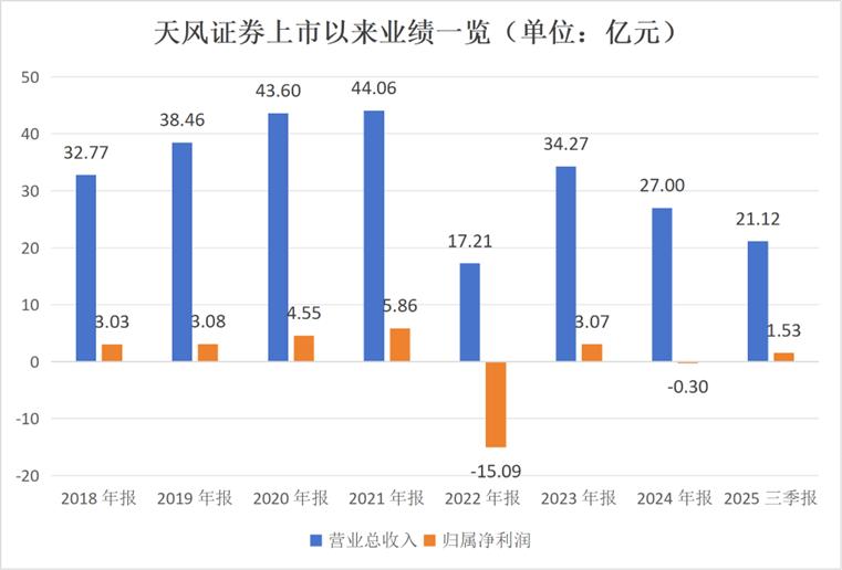 2025年前三季度,随着A股市场走强,证券行业的业绩普遍出现增长。天风证券实现营收为21.12亿元,同比增长57.53%;实现归属净利润为1.53亿元,同比增长128.55%。