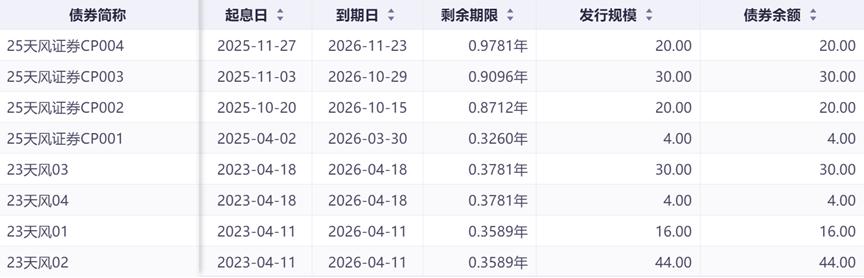 从已发行债券来看,截至12月1日,天风证券共有8张存量债券,合计发行规模为168亿元。其中,4张为公司债,将于2026年4月份到期;4张为短期融资券,最晚到期日为2026年11月。也就是说,上述债券将在未来1年内到期,届时或给天风证券带来更大的流动性压力。