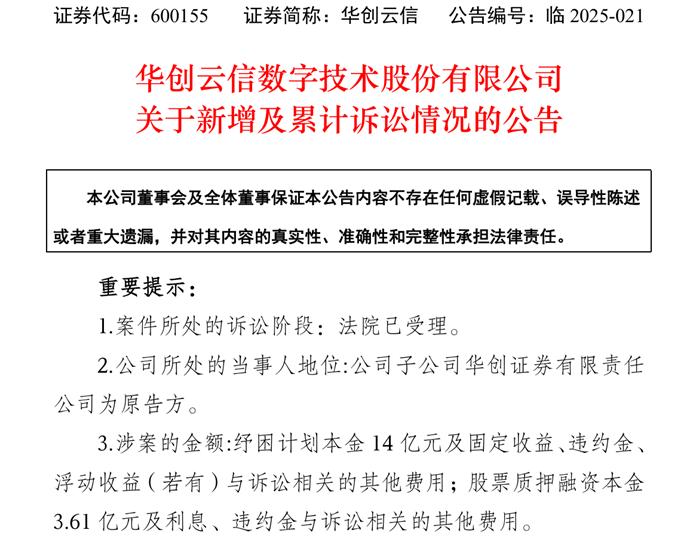 据华创云信披露,华创证券对姜伟等人提起诉讼,要求偿还纾困计划本金14亿元及固定收益、违约金、浮动收益(若有)与诉讼相关的其他费用;股票质押融资本金3.61 亿元及利息、违约金与诉讼相关的其他费用,合计超过17.61亿元。
