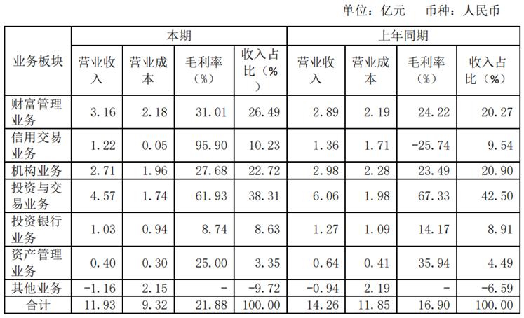 分业务来看,除财富管理业务外,其余5大业务的收入均出现下滑。其中,投资与交易业务实现收入为4.57亿元,同比下滑24.59%;信用交易业务和机构业务的收入也分别减少约0.14亿元和0.27亿元。