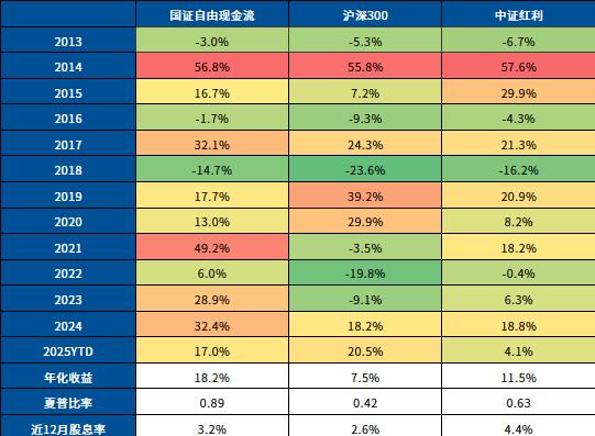 从收益表现上看,国证自由现金流指数长期收益表现优异,2013年以来年化收益18.2%;高于中证红利的11.5%,且在高收益的前提下波动较低,风险收益比出色。分年度来看,指数自发布以来在过去13年中有10年录得正收益,在下行市中韧性凸显,在上行市中也有不错的收益,可以做到穿越周期。