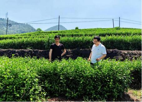 图为稠州银行客户经理在黄山头村调研茶园建设 谢晓芬/摄