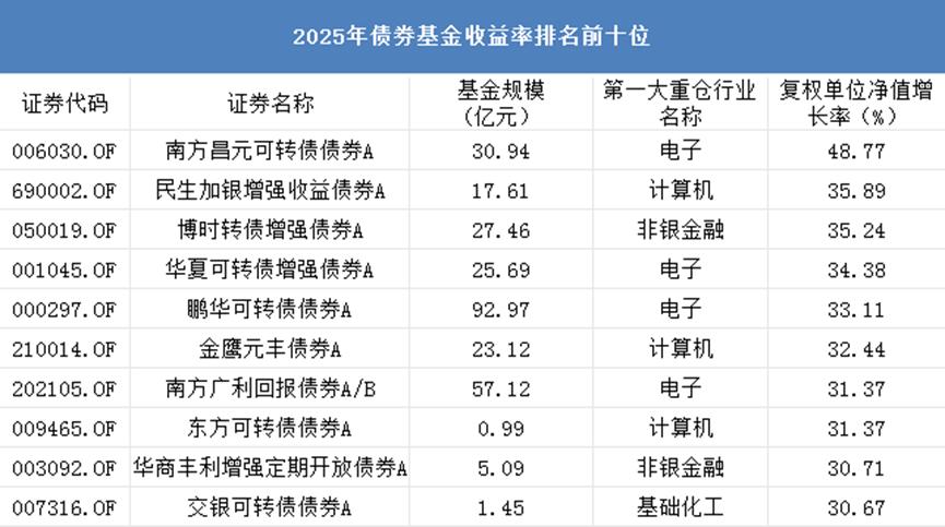 其中,业绩最好的债基是南方昌元可转债债券,年内收益率达到48.77%,其次为民生加银增强收益债券,收益率为35.89%。博时基金、华夏基金和鹏华基金旗下可转债基金收益率也超过30%。