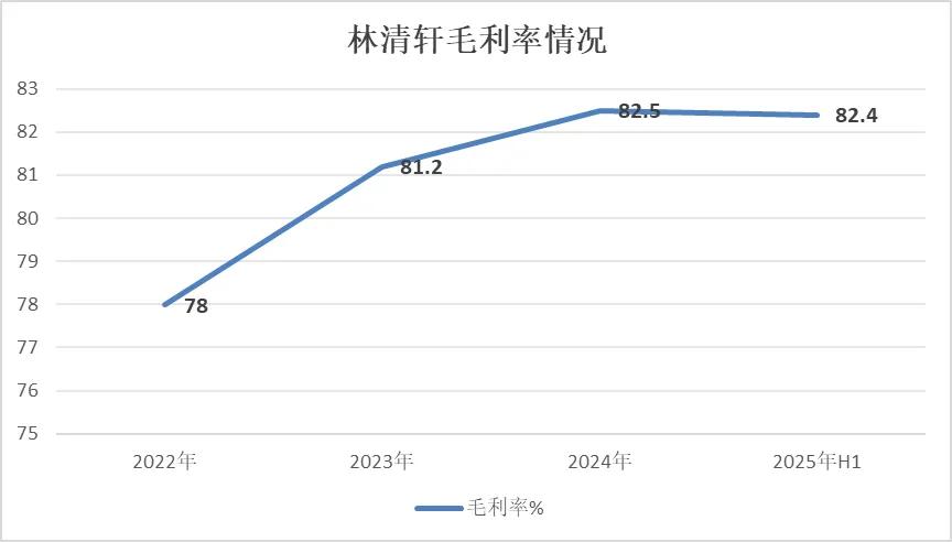 高毛利,是林清轩最受关注也最具争议的财务标签。2022年至2024年,其毛利率从78%一路攀升至82.5%,2025上半年虽微降至82.4%,但仍远高于珀莱雅、贝泰妮等国货同行70%-75%的水平。