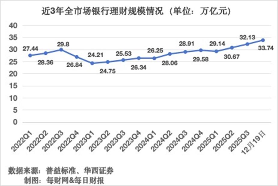 因此,在以上多重因素的驱动下,2025年我国银行理财规模持续扩容,据华西证券测算数据显示,截至2025年12月19日,银行理财规模约33.74万亿。