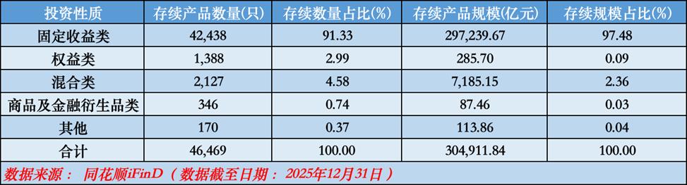 根据同花顺IFind数据,固收类产品存续规模占比连续四个季度超过97%。截至2025年12月31日,固收类产品存续规模29.72万亿元,较年初增长9.19%,在全市场总规模中占比依旧超9成;存续产品数量总计达42438只,较年初增加了6541只,占比91.33%,成为推动理财市场规模增长的主要力量。混合类、权益类、商品及金融衍生品类等其他类型产品合计占比不足3%,显示理财市场仍以稳健型资产为主,风险相对较高的理财产品对投资者吸引力明显减弱。