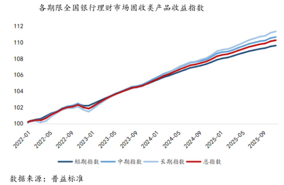 固收类产品逐步寻找替代性配置策略,全年收益表现较为稳健。数据显示,2025年固定收益类理财产品收益率围绕2.50%上下波动,成为市场“压舱石”。值得注意的是,根据普益标准数据,纯固收产品平均今年以来年化收益率可达2.75%,展现出独有的产品韧性,在低波稳健的道路上走得愈发踏实,部分配债比例较高的产品能够凭借债券价格上涨获得可观的收益。