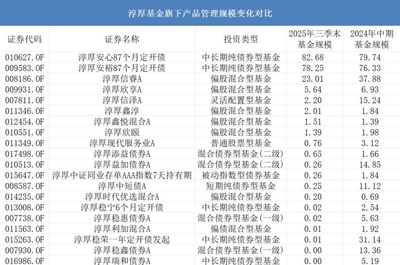此外,淳厚信泽混合、淳厚益加债券、淳厚稳鑫债券、淳厚中短债等管理规模超过10亿元的产品,2025年三季度末管理规模亦显著下滑,部分产品已经沦为规模5000万元以下的“迷你”基金,低于基金合同规定的清算线。