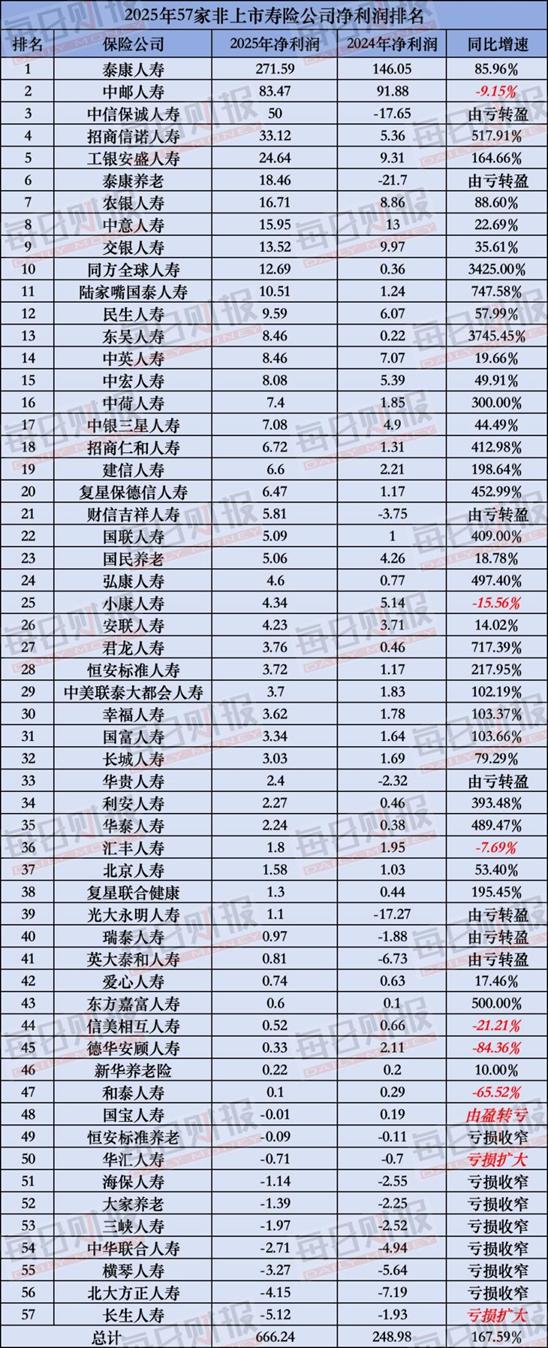 据《每日财报》统计,剔除新旧会计准则切换影响,2025年这57家非上市寿险公司总计取得保险业务收入约1.2万亿元,较2024年的1.08万亿元,同比增长了11.46%;净利润总计666.24亿元,相比2024年的248.98亿元有大幅提升,增速高达167.59%。