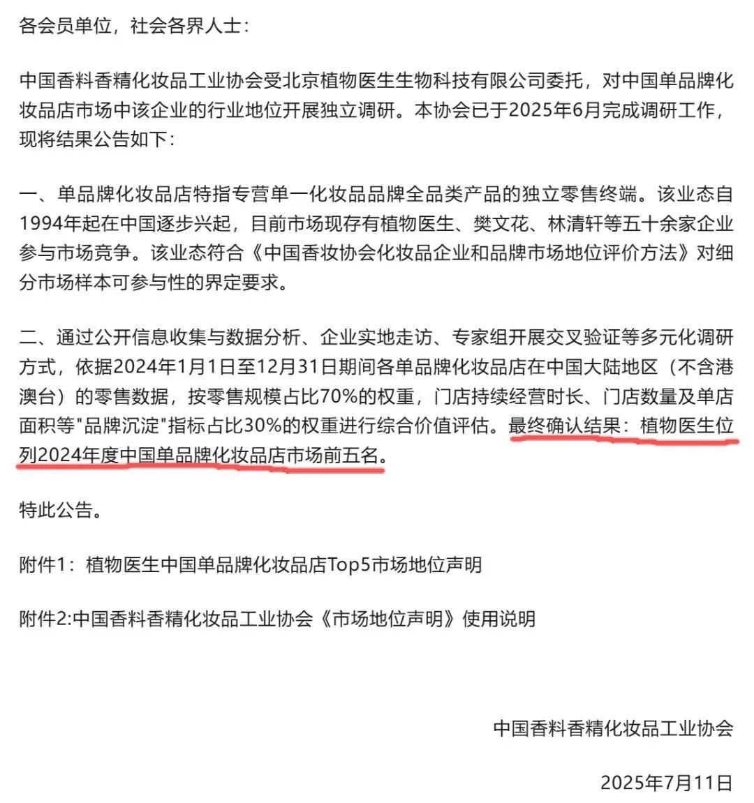 值得注意的是,植物医生着力打造的“中国单品牌化妆品店第一名”这一核心标签,也存在信披争议。在深交所第二轮问询中,该标签已被要求作出详细解释说明。公司回应称,此排名依据中国香料香精化妆品工业协会(以下简称“中国香料协会”)出具的研究报告,按2024年度全渠道零售额计算,其在特定口径下位列第一;但中国香料协会官微2025年7月发布的推文显示,其对植物医生的市场地位表述为“中国单品牌化妆品店TOP5”,与公司招股书所称的“第一名”存在明显矛盾,进一步引发市场对其信披真实性的质疑。