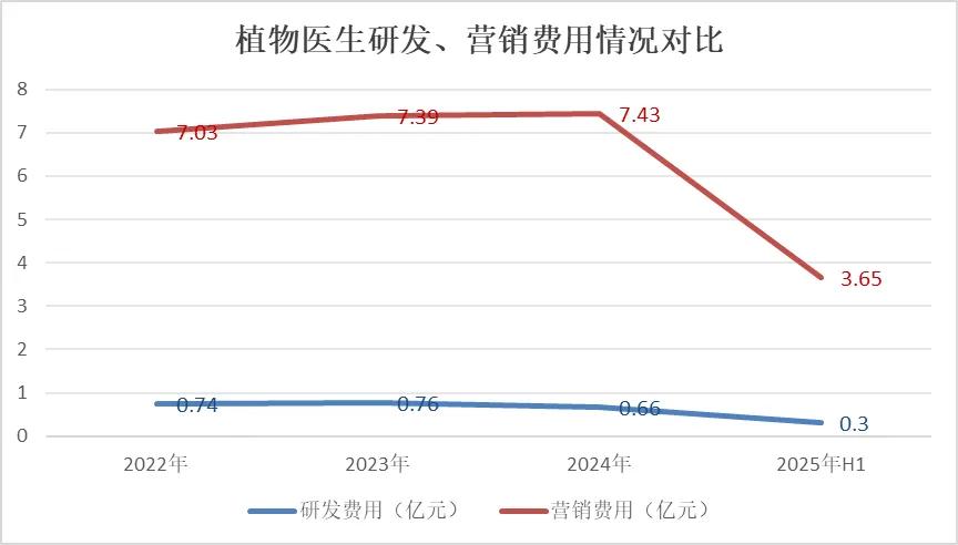 渠道困境之外,植物医生的费用结构也折射出“重营销、轻研发”的经营隐忧。 2022至2024年,公司销售费用分别为7.03亿、7.39亿、7.43亿元,三年累计高达21.85亿元,占营收比例稳定在33%-35%之间。2025年上半年,公司销售费用占比进一步攀升至38%。