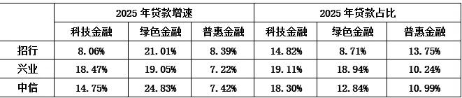 宏观干扰无可避免,但行业纷纷选择通过调整资源配置、响应“五篇大文章”号召,进一步优化资产结构。整体而言,全行业2025年向科技、绿色、普惠、养老、数字五大方向的贷款增速为11.5%、20.2%、10.9%、50.5%和14.1%。三家股份行也积极融入时代需求,加大力度扶持重点领域和新质生产力,紧跟政策步伐布局优质资产。从同口径数据来看,三家股份行在重点方向和新经济领域的投放增速显著高于均值。