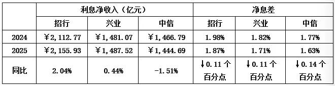 对比三家股份行,2025年的计息负债成本率均有所下降,其中 “零售之王”招行计息负债率明显优于同业,而兴业压缩成本0.43个百分点更为显著。正如兴业银行董事长吕家进在业绩说明会上表示,兴业银行将压缩负债成本作为稳定息差的核心抓手,通过多项举措有效管控负债成本——这基本上也是行业的一个肖像。值得一提的是,兴业银行2025年利息净收入达1487.52亿元,连续三年保持正增长。