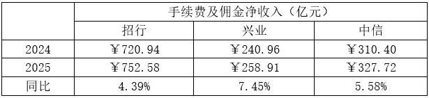 深耕客群管理的背后,是为资产管理和财富管理奠定长远的流量基础。得益于高价值用户的提升和业务类型的丰富,三家股份行在2025年均实现“手续费及佣金净收入”的正向增长,零售客户存量较高的招行和中信的中收较高,兴业银行则发力追赶,增速高于其他两家。其中各家在资产管理和财富管理相关的手续费收入增速更为明显:中信理财业务业务大幅增长45.17%、招行财富管理增长21.39%,兴业的托管及代理收入同比增长17.54%。