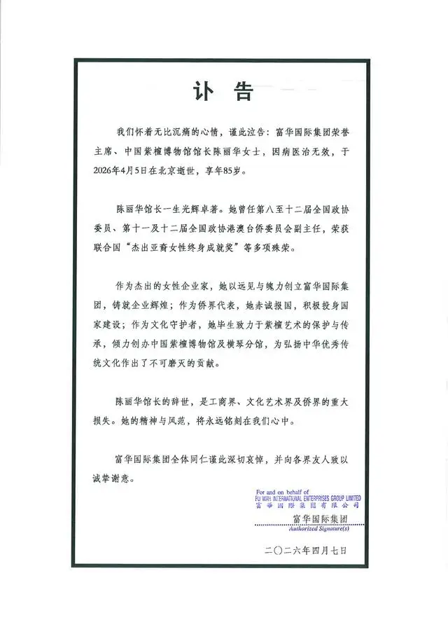4月7日,富华国际集团发讣告:我们怀着无比沉痛的心情,谨此泣告:富华国际集团荣誉主席、中国紫檀博物馆馆长陈丽华女士,因病医治无