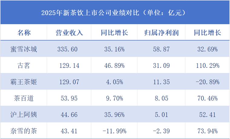 从竞争格局来看,新茶饮赛道的发展局势可称为“一超多强”。蜜雪冰城作为超一线的新茶饮品牌,2025年营收达到335.60亿元,净利润达到58.87亿元,同比增速均超过30%。该业绩在各大品牌中大幅度领先,反映出下沉市场巨大的消费容量。