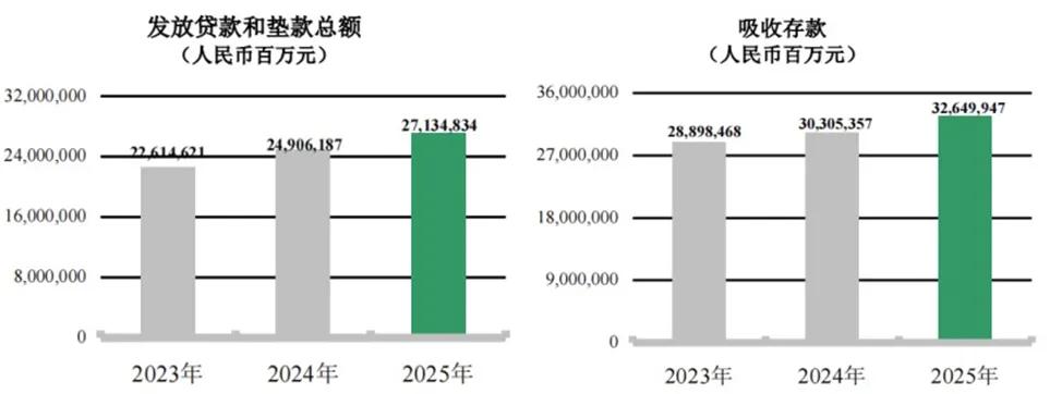 规模方面,截至2025年末,农业银行总资产规模达到48.78万亿元,同比增长12.83%,扩表速度位居大行前列;贷款总额27.13万亿元,同比增长8.96%;存款总额32.65万亿元,同比增长7.92%。