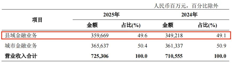 受益于此,农行县域金融业务几乎快撑起了营收半边天,2025年该业务创收3596.69亿元,同比增长约3%,占总营收的比重进一步提升至49.6%,几乎快与城市金融业务持平了,目前该业务贡献占比达50.4%。